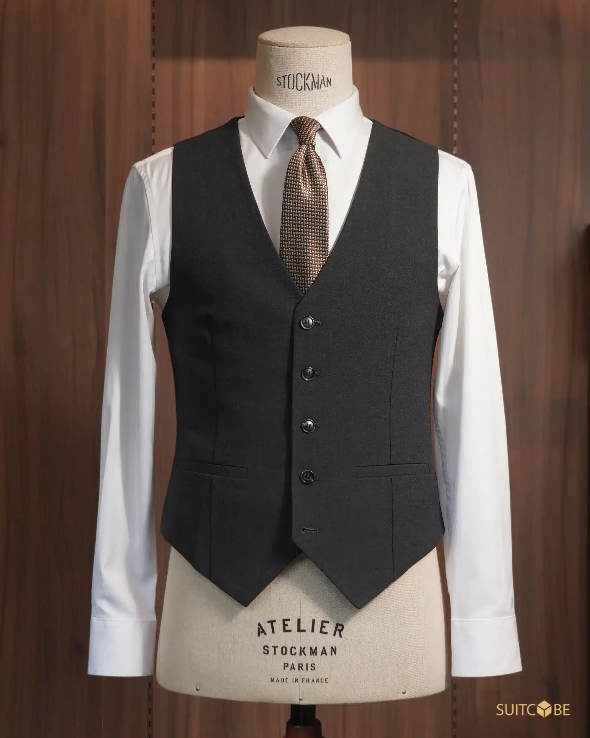 เสื้อกั๊กผู้ชายสีเทา ทรงสลิมฟิตมีสายปรับตามสรีระ ผลิตจากผ้าวูล 50% เหมาะสำหรับใส่คู่กับเสื้อสูท หรือเสื้อเชิ้ต